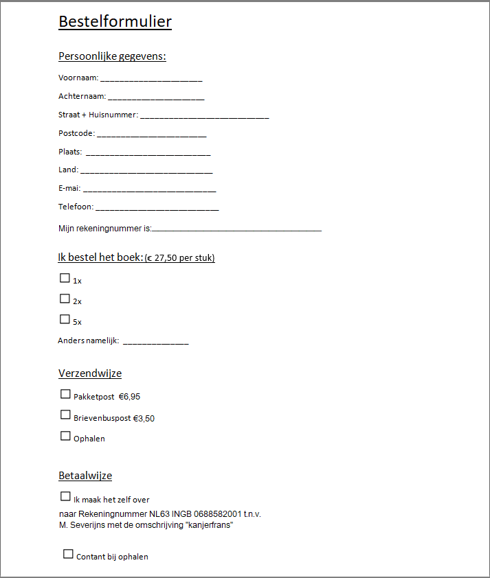 U kunt het volgende bestelformulier printen of hier downloaden en invullen. Vervolgens kunt u deze e-mailen (zie contact of mail naar: This email address is being protected from spambots. You need JavaScript enabled to view it.).